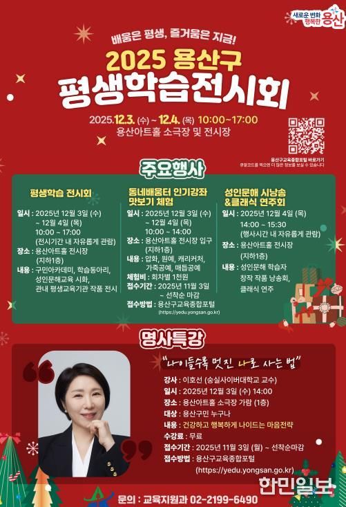 한민일보 서울포커스 김서윤 기자 | 서울 용산구가 오는 12월 3일부터 4일까지 용산아트홀 전시장과 소극장에서 ‘배움은 평생, 즐거움은 지금!’을 주제로 ‘2025 평생학습 전시회’를 개최한다.