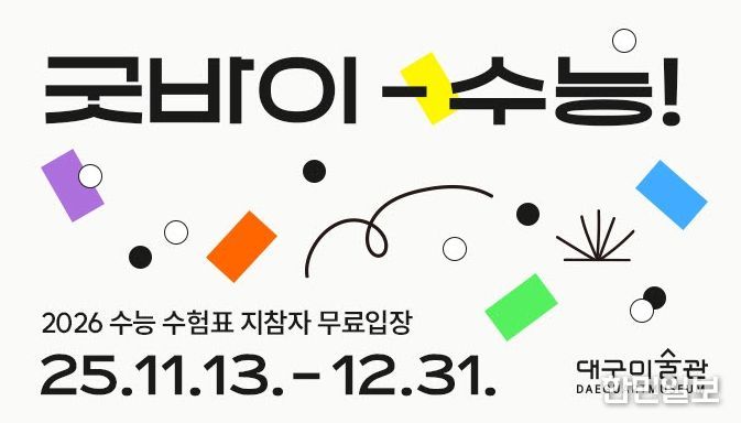 한민일보 서울포커스 김봉순 기자 | (재)대구문화예술진흥원 대구미술관은 2026학년도 대학수학능력시험을 마친 수험생을 대상으로 11월 13일부터 12월 31일까지 무료입장 행사를 실시한다.