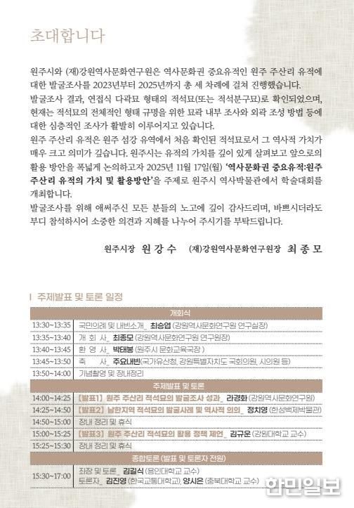 한민일보 서울포커스 임경복 기자 | 원주시역사박물관과 강원역사문화연구원은 오는 17일 오후 1시부터 5시까지 박물관 1층 강당에서, 섬강 횡성지구 하천환경정비사업 구간에서 발견된 유적의 발굴 성과를 공유하는 학술대회를 개최한다.