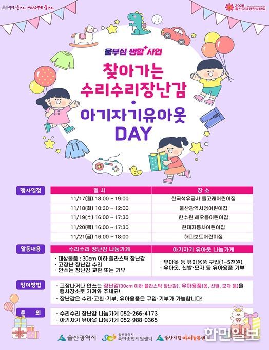 한민일보 서울포커스 임경복 기자 | 울산시는 오는 17일부터 21일까지 5일간 관내 주요 직장어린이집을 대상으로 ‘우리아이, 행복배달 사업(프로젝트): 찾아가는 장난감·유아옷 데이(DAY)’ 행사를 진행한다고 밝혔다.