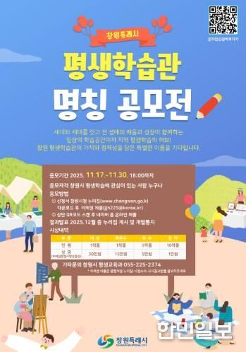 한민일보 서울포커스 김서윤 기자 | 창원특례시는 지역 평생학습의 중심이 될 ‘창원특례시 평생학습관’의 명칭 공모를 오는 11월 17일부터 30일까지 14일간 진행한다고 밝혔다.