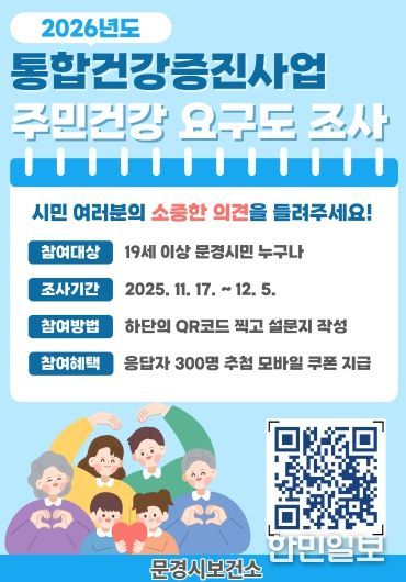 한민일보 서울포커스 김봉순 기자 | 문경시보건소(소장 박애주)는 주민들을 대상으로 17일부터 12월 5일까지 약 3주간 ‘통합건강증진사업 주민요구도 조사’를 한다.