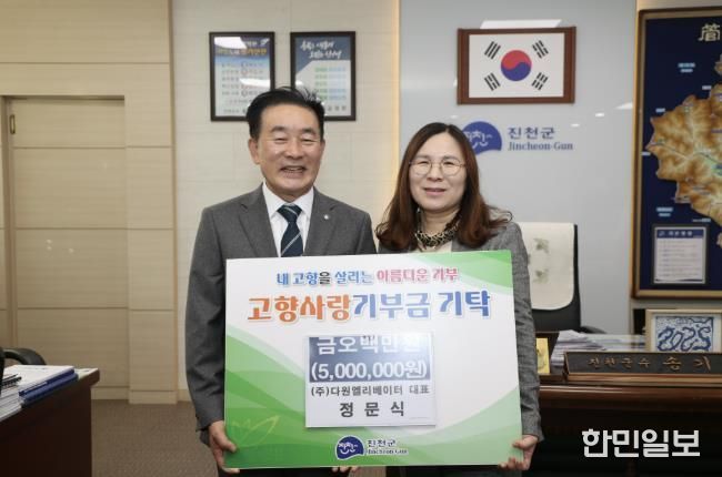 한민일보 서울포커스 김다남 기자 | 충북 진천군은 14일 다원엘리베이터(주) 정문식 대표와 입센몰 어성란 대표가 진천을 방문해 고향사랑기부금 각 500만원, 200만원을 기탁했다고 밝혔다.