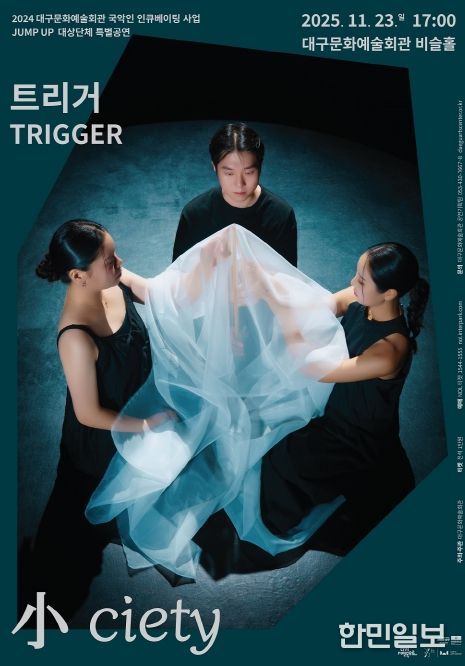 한민일보 서울포커스 김봉순 기자 | 대구문화예술회관은 2024년 국악인 인큐베이팅 사업 'JUMP UP' 대상단체 특별공연으로, 한국 현악 트리오 트리거(TRIGGER)의 창작 공연 '小ciety'를 오는 11월 23일 비슬홀에서 선보인다.