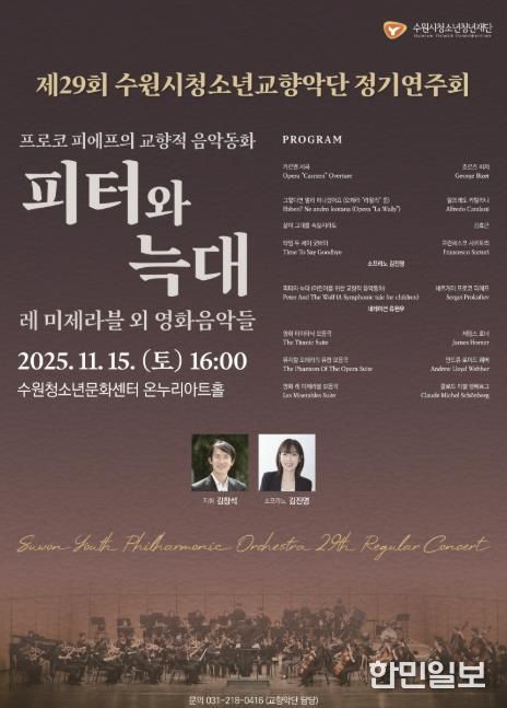 한민일보 서울포커스 진광성 기자 | 수원시청소년청년재단 수원청소년문화센터에서는 오는 11월 15일 오후4시, 온누리아트홀에서 제29회 정기연주회를 개최한다. 이번 연주회는 ‘프로코 피에프의 교향적 음악동화 '피터와 늑대'’를 중심으로, 세대를 아우르는 감동의 영화음악을 함께 선보이며 청소년 단원들의 풍성한 음악적 성장을 보여줄 예정이다.