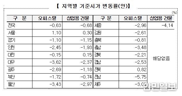 기준시가(안)에 따르면, 오피스텔은 전년 대비 0.6 % 하락, 상업용 건물은 전년 대비 0.7 % 하락한 것으로 확인된다. 다만, 서울 지역의 오피스텔과 상업용 건물 기준시가는 공히 각각 1.1 %, 0.3 % 상승한 것으로 나타난다.