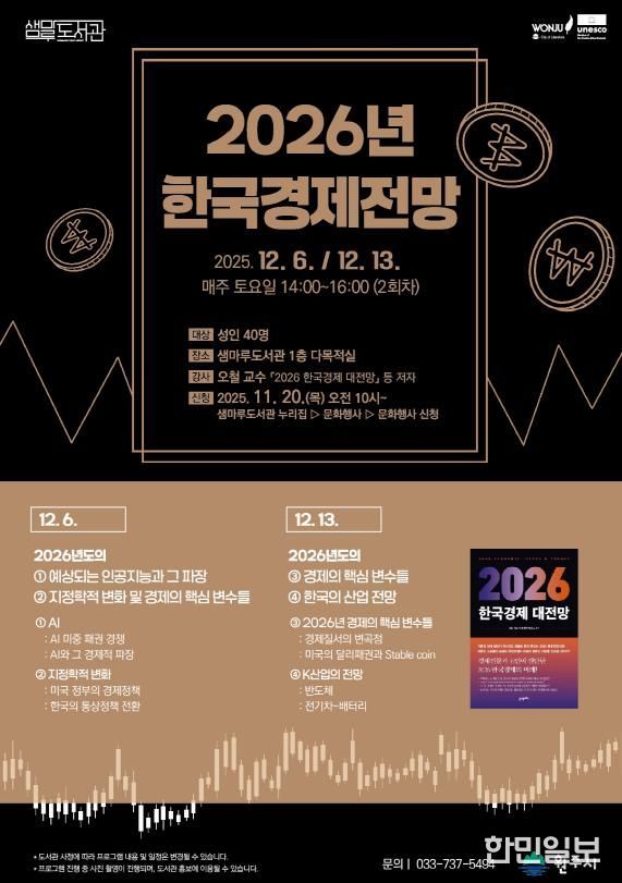 한민일보 서울포커스 임경복 기자 | 원주시 샘마루도서관은 시민들의 독서문화 향유 기회를 확대하기 위해 ‘2025년 하반기 토요 특강’을 운영하고 있으며, 오는 12월 마지막 강좌로 ‘2026년 한국경제전망’을 운영한다.