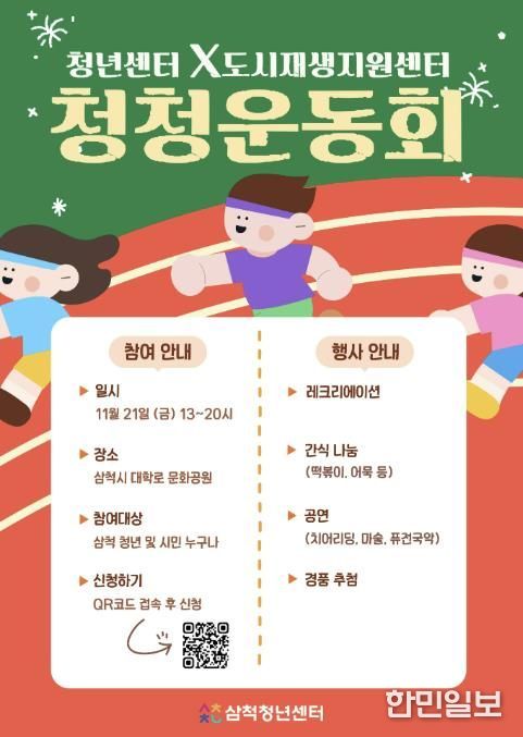 한민일보 서울포커스 임경복 기자 | 삼척청년센터는 오는 11월 21일 오후 1시, 삼척 대학로 문화공원에서 ‘2025 삼척청년센터와 함께하는 청춘청년 운동회’를 개최한다.