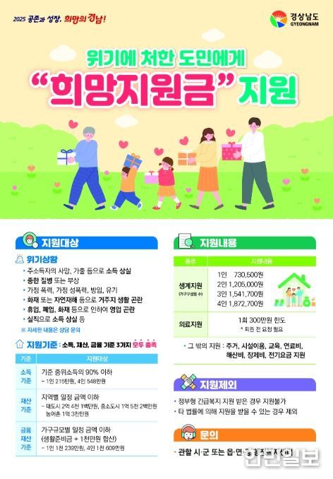 희망지원금은 올해 처음 경남도가 현행 법·제도에서 제외된 저소득 가구 중 위기상황에 처한 가구에 생계비, 의료비 등을 지원받을 수 있도록 도입한 경남형 긴급복지 제도이다.