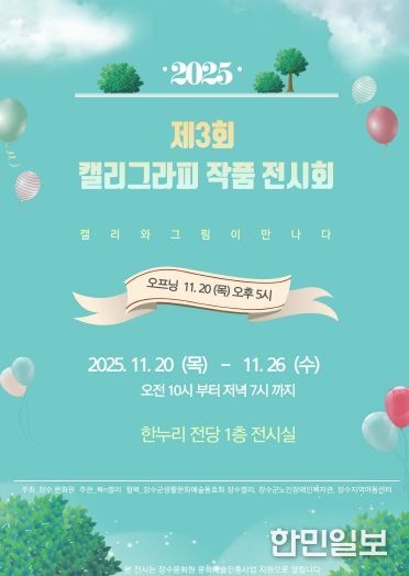 이번 전시는 장수문화원이 주최하고 북n캘리가 주관했으며, 장수군생활문화예술동호회 장수캘리, 장수군노인장애인복지관, 장수지역아동센터가 협력해 진행된다.