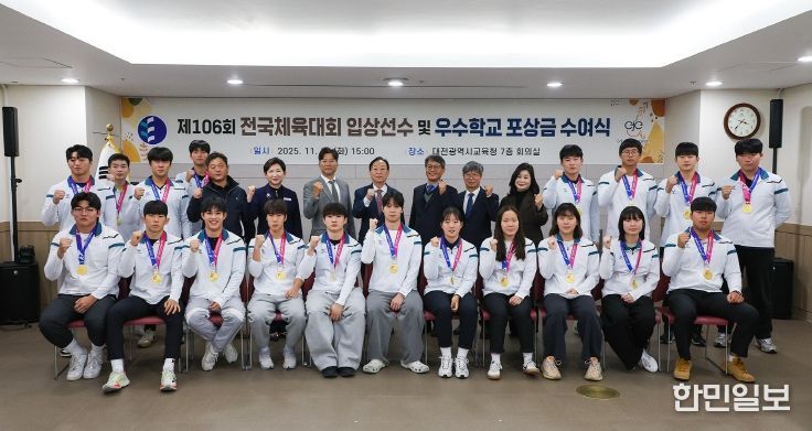 한민일보 서울포커스 유한희 기자 | 대전시교육청은 11월 18일 오후 3시 본관 701호 회의실에서, 지난 10월 17일부터 23일까지 7일간, 부산광역시 일원에서 열린‘제106회 전국체육대회 학생선수 메달 입상자 및 우수학교 포상금 수여식’을 개최했다.