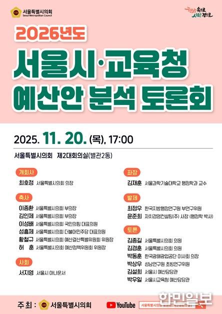 한민일보 서울포커스 국용호 기자 | 서울특별시의회는 2025년 11월 20일 오후 5시, 서울특별시의회 제2대회의실에서 '2026년도 서울시·교육청 예산안 분석 토론회'를 개최한다.