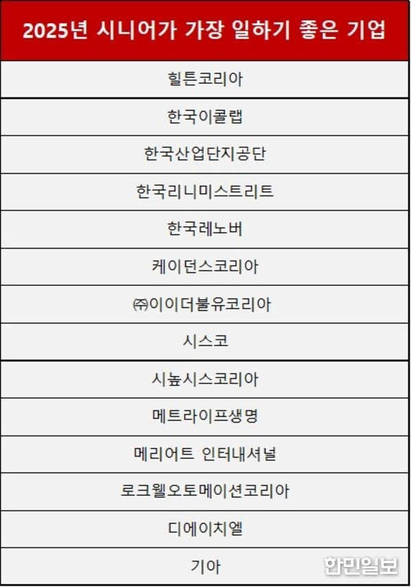 2025년 선정된 기업들은 시니어 직원들을 배려한 정책과 프로그램으로 조직 내 신뢰와 존중 문화를 형성했다는 점에서 높은 평가를 받았다. '2025년 대한민국 시니어가 가장 일하기 좋은 기업은 다음과 같다.