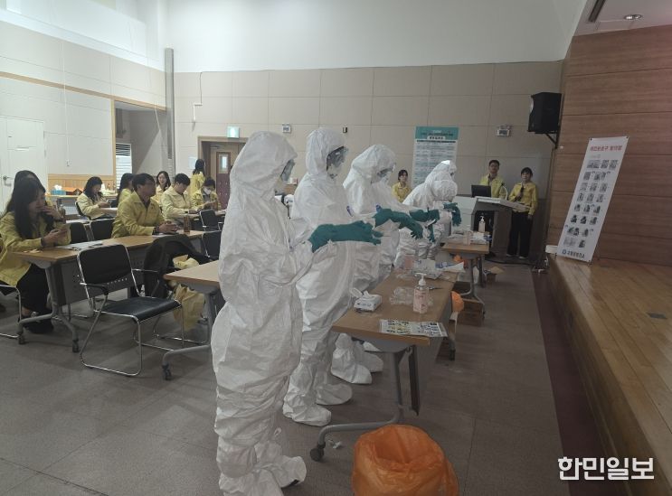 최근 국내외 가금류·야생조류에서 고병원성 AI가 지속 확인되고 있어 지역사회 감염 차단을 위한 예방교육과 상황 발생 시 고위험군 보호, 초기 대응 역량 확보에 대한 모의훈련을 진행됐다.