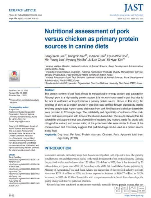 연구진은 비글견 12마리에게 닭고기 기반 사료와 돼지고기 뒷다리살을 단백질원으로 제조한 시험 사료를 각각 15일간 급여한 후, 소화율과 기호성을 비교 평가했다.