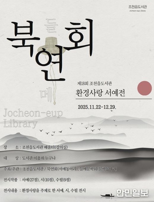 한민일보 서울포커스 김다남 기자 | 제주시 조천읍도서관은 11월 22일부터 12월 27일까지 도서관 1층 배움터에서 ‘제18회 환경사랑 서예전’을 개최한다.