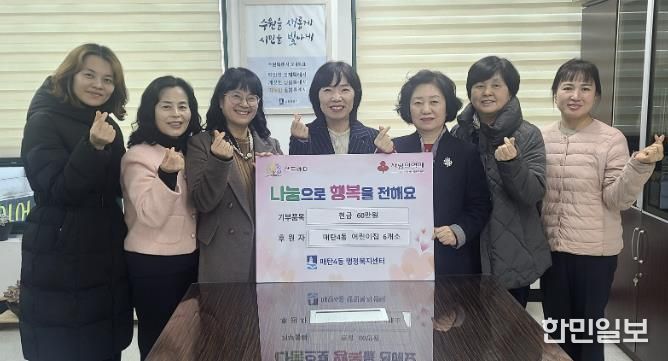 민상희 매탄4동장은 “어린이집 원장님들께서 보여주시는 꾸준한 이웃사랑이 우리 아이들에게 좋은 본보기가 되고 있다”며 “전달된 성금은 따뜻한 마음이 온전히 전해질 수 있도록 꼭 필요한 곳에 소중하게 사용하겠다”고 감사의 마음을 전했다.