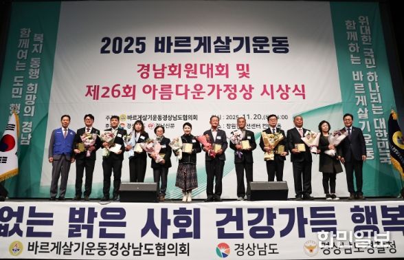한민일보 서울포커스 박근원 기자 | 경상남도가 20일 창원컨벤션센터에서 열린 ‘2025 바르게살기운동 경남 회원대회 및 제26회 아름다운 가정상 시상식’에서 지역사회 봉사에 앞장서 온 회원들을 격려했다.