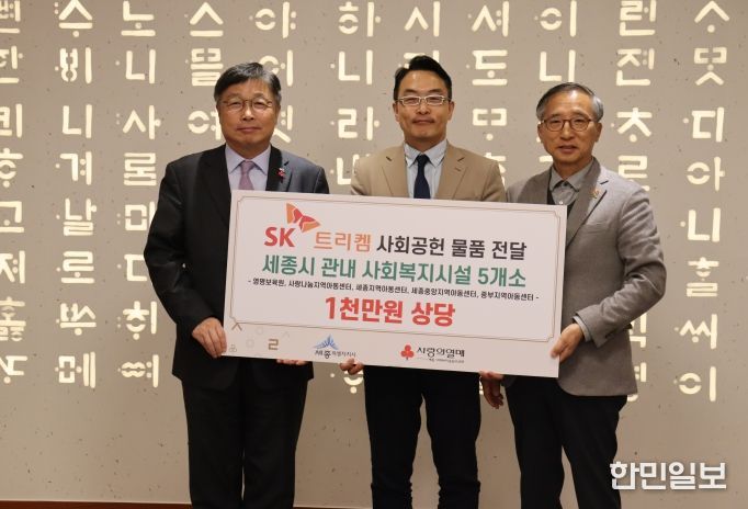 한민일보 서울포커스 김윤이 기자 | 세종사회복지공동모금회(회장 박상혁, 이하 세종모금회)에 따르면 11월 20일 세종특별자치시 세종시청 접견실에서 이승원 세종특별자치시 부시장, 하정환 SK트리켐 대표, 김윤회 세종모금회 부회장이 참석한 가운데 ‘세종시 관내 사회복지시설 1천만원 상당 물품전달식’을 가졌다.