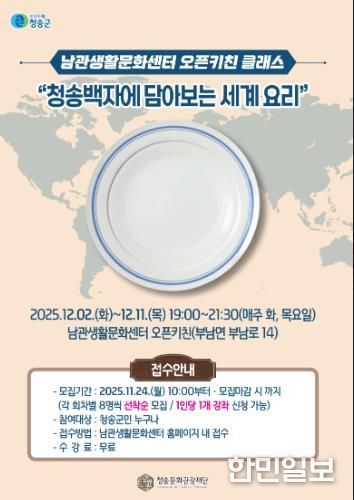 한민일보 서울포커스 김봉순 기자 | (재)청송문화관광재단은 지역 대표 문화유산인 청송백자에 세계 각국의 음식을 직접 만들어 담아보는 체험형 요리 수업 ‘청송백자에 담아보는 세계 요리’를 오는 12월 2일부터 11일까지 매주 화·목 저녁 7시부터 9시 30분까지 남관생활문화센터 오픈키친에서 총 4회 운영한다고 밝혔다.
