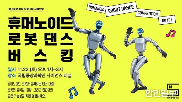 한민일보 서울포커스 기자 | 과학기술정보통신부 국립중앙과학관은 11월 22일 오후1시, 사이언스 터널에서 관람객이 로봇과 함께 뛰고‧춤추고‧복싱을 체험하며 로봇과 자연스럽게 친숙해 질 수 있는 ‘휴머노이드 로봇 댄스 버스킹’ 이벤트를 개최한다고 밝혔다.