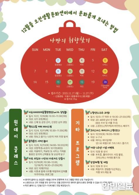 한민일보 서울포커스 전희주 기자 | 의왕시가 오전생활문화센터(오전동길 61) 개관 2주년과 크리스마스 시즌을 맞아 시민들과 함께 즐길 수 있는 특별 프로그램 ‘오전생활문화센터, 올해도 크리스마스를 부탁해’를 12월 1일부터 31일까지 한 달간 운영한다.