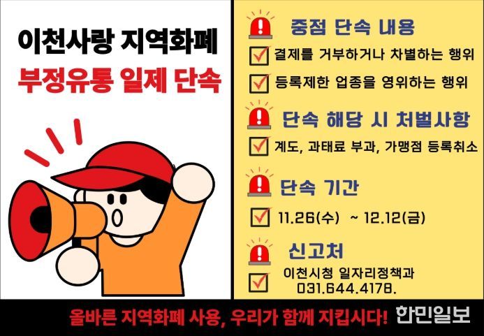 한민일보 서울포커스 박용남 기자 | 이천시는 경기이천사랑지역상품권의 올바른 사용 환경을 조성하고 건전한 유통 질서를 확립하기 위해 11월 26일부터 12월 12일까지 지역사랑상품권 부정유통 근절을 위한 일제 단속을 추진한다고 밝혔다.