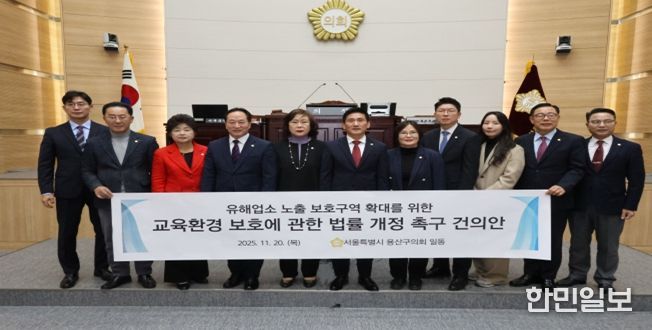 한민일보 서울포커스 국용호 기자 | 용산구의회는 11월 20일 열린 제302회 정례회 제1차 본회의에서 황금선 의원이 대표 발의한 ‘교육환경 보호에 관한 법률 개정 촉구 대정부 건의안’을 의결했다.