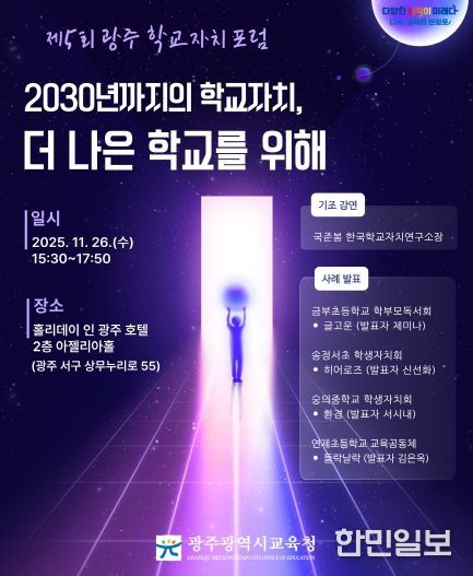 한민일보 서울포커스 박용남 기자 | 광주시교육청이 오는 26일 홀리데이 인 광주 호텔 2층 아젤리아홀에서 ‘제5회 광주 학교자치 포럼’을 개최한다.