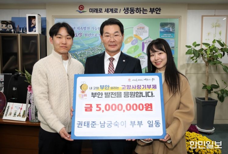 한민일보 서울포커스 김용택 기자 | 부안군은 25일 결혼한 지 한 달도 채 되지 않은 새내기 부부가 어려운 살림에도 불구하고 고향사랑기부금 500만원을 기탁해 지역사회에 큰 감동을 주고 있다고 밝혔다.