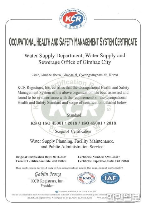 한민일보 서울포커스 김은금 기자 | 김해시는 상수도 분야에서 안전보건 국제표준인 ISO 45001(안전보건경영시스템) 인증을 취득했다고 26일 밝혔다.