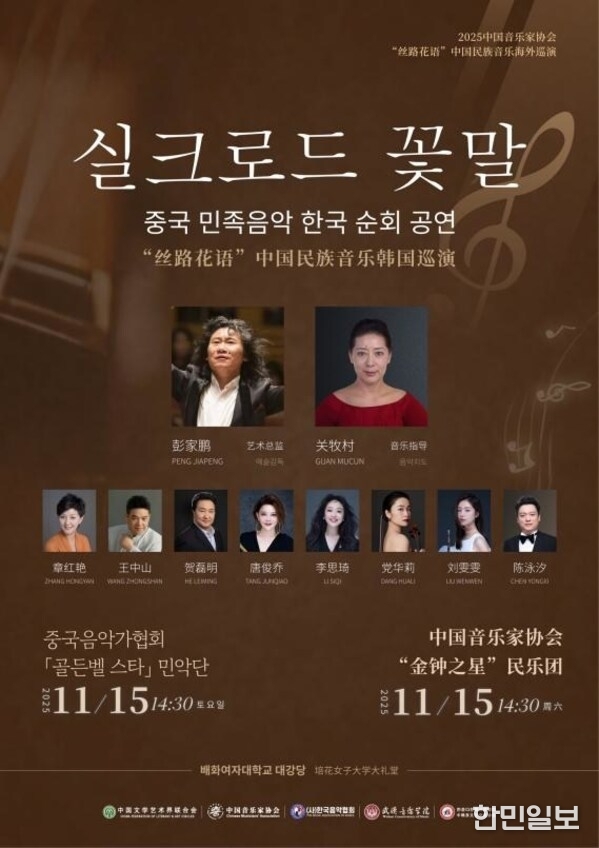 한민일보 서울포커스 최성훈 기자 | 선전, 중국 2025년 11월 26일 -- 중국음악가협회(Chinese Musicians' Association)의 주관하에 '골든벨스타(Golden Bell Stars)' 현대식 중국 연주단이 한국에서 '실크로드의 꽃비(Silk Road Blossoms)'라는 제목의 중국 민속 음악 순회공연을 성황리에 마쳤다.