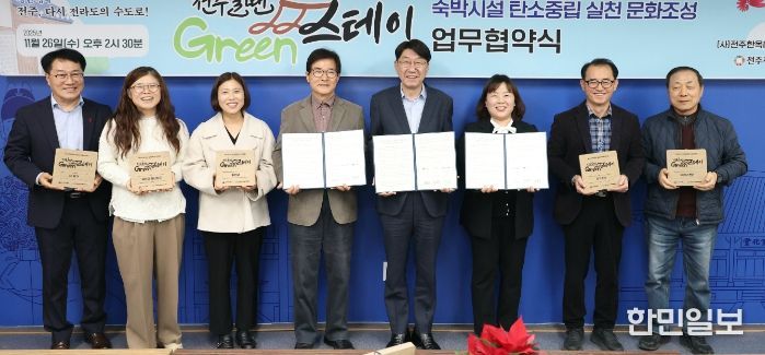 전주시와 (사)전주한옥마을숙박체험업협회, 전주지속가능발전협의회는 26일 시청 3층 회의실에서 숙박시설의 탄소중립 실천 문화 조성을 위한 협력체계를 구축하는 ‘전주올땐그린스테이 협약식’을 개최했다.
