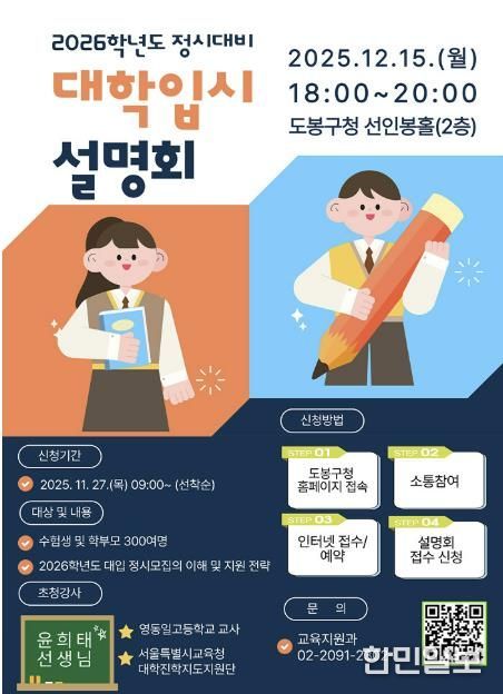 한민일보 서울포커스 김봉순 기자 | 서울 도봉구가 12월 15일 오후 6시 도봉구청 2층 선인봉홀에서 2026학년도 대입 정시 전략 설명회를 개최한다.