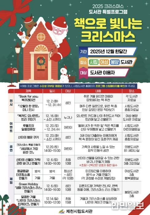 한민일보 서울포커스 김다남 기자 | 제천시립도서관은 2025년 연말을 맞이하여 12월 한 달간 특별프로그램 ‘책으로 빛나는 크리스마스’를 운영한다.