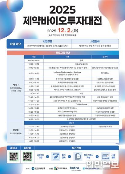 한민일보 서울포커스 유창렬 기자 | 인천광역시가 주최하고 인천관광공사와 KOTRA, 한국제약바이오협회가 공동 주관하는 ‘제약바이오투자대전’이 오는 12월 2일 인천 송도컨벤시아 프리미어볼룸에서 열린다.