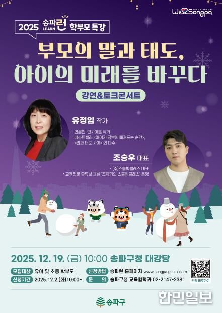 한민일보 서울포커스 박정민 기자 | 서울 송파구가 내달 19일 10시 구청 4층 대강당에서 올해 마지막 학부모 특강 '부모의 말과 태도, 아이의 미래를 바꾸다'를 개최한다고 알렸다.