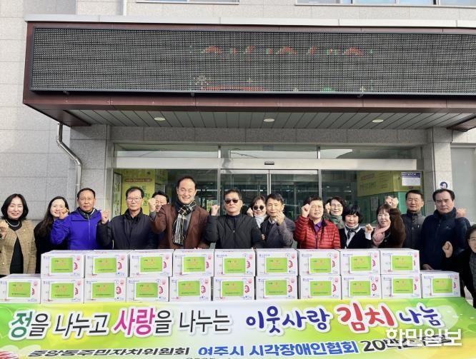 한민일보 서울포커스 전희주 기자 | 여주시 중앙동 주민자치위원회는 26일 행정복지센터에서 여주 시각장애인협회에 김치 20박스 전달식을 진행했다.