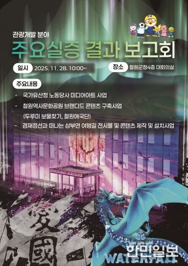 한민일보 서울포커스 진광성 기자 | 철원군은 지역 관광 경쟁력 강화를 위해 추진한 다양한 실증 사업의 성과를 공유하는 자리를 마련한다. 2025.11.28일 오전 10시 철원군청 4층 대회의실에서 관광개발 분야 주요실증 결과보고회가 개최된다.