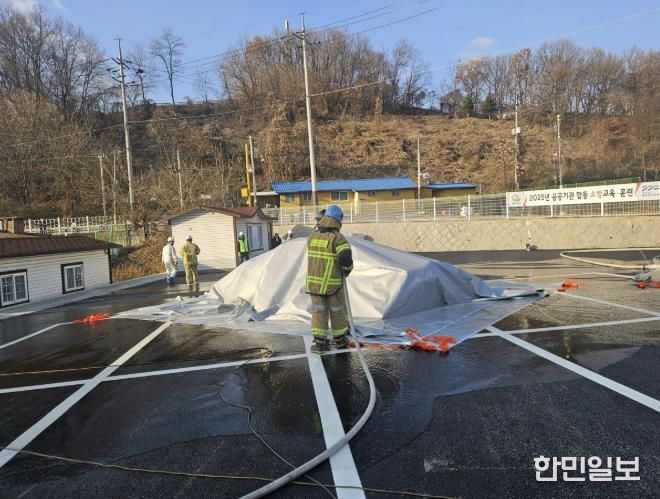 이번 훈련은 자위소방대 편성 및 운영 교육과 전기차 화재 진압 실습 순으로 진행됐으며, 특히 동두천소방서와 함께 전기차 화재 상황을 가정해 질식소화포를 활용한 화재 진압 훈련을 실시했다.