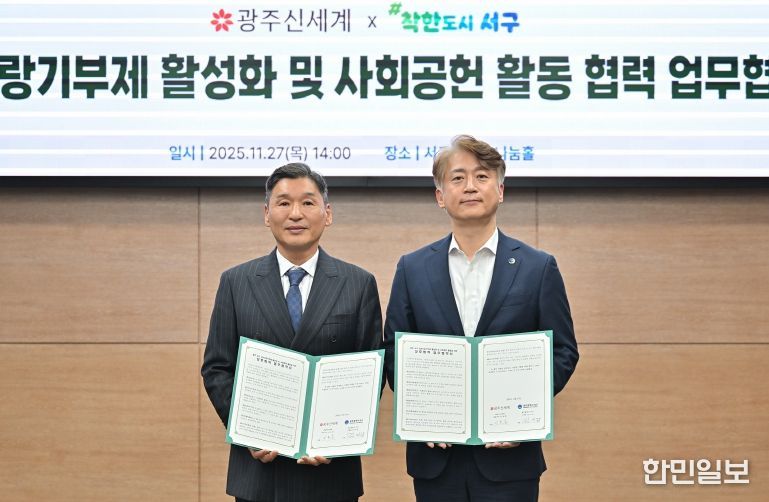한민일보 서울포커스 박용남 기자 | 광주광역시 서구가 지역 대표 기업과 함께 나눔문화 확산과 지역 활력 제고에 나선다. 서구는 27일 서구청 나눔홀에서 ㈜광주신세계(대표이사 이동훈)와 ‘광주 서구 고향사랑기부제 활성화 및 사회공헌 활동을 위한’ 업무협약을 체결했다.
