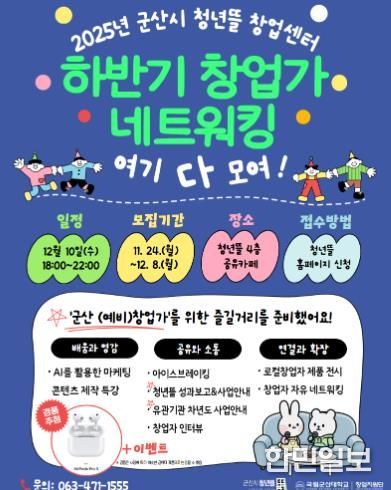 한민일보 서울포커스 김용택 기자 | 군산시 청년뜰 창업센터에서 지역 창업가 간 정보공유 및 네트워킹 강화를 위한 ‘2025년 하반기 창업가 네트워킹’의 참여자를 12월 8일까지 모집한다.