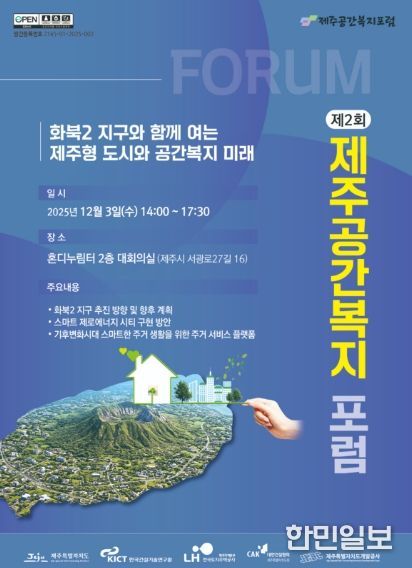 한민일보 서울포커스 임경복 기자 | 제주특별자치도개발공사(사장 백경훈)는 12월 3일 14시 제주특별자치도, 한국건설기술연구원, 한국토지주택공사 제주지역본부, 대한건설협회 제주특별자치도회와 “화북2 지구와 함께 여는 제주형 도시와 공간복지 미래”라는 주제로 도민과 함께하는 제2회 제주 공간복지 포럼을 혼디누림터 2층에서 개최한다고 밝혔다.