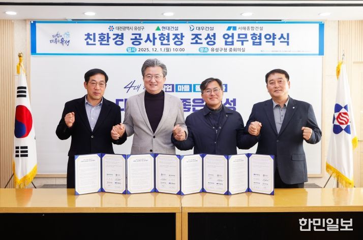 한민일보 서울포커스 진광성 기자 | 대전 유성구는 1일 유성구청 중회의실에서 대형 건축 공사장 시공사와 ‘친환경 공사 현장 조성 업무 협약’을 체결했다.
