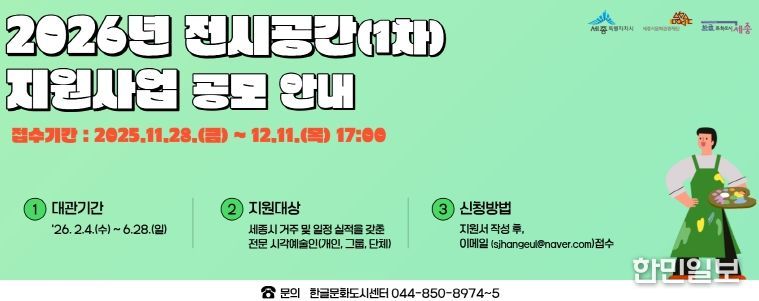 한민일보 서울포커스 김윤이 기자 | 세종시문화관광재단 한글문화도시센터는 11월 28일부터 12월 11일까지 지역 시각예술*인의 창작활동을 지원하기 위해 ‘2026년 전시공간 지원사업(1차)’ 공모를 진행한다.