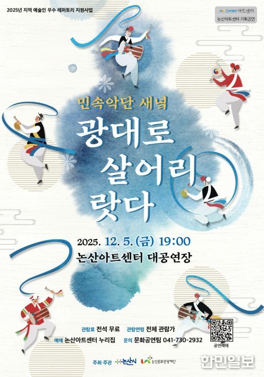 한민일보 서울포커스 유돈상 기자 | (재)논산문화관광재단은 오는 12월 5일 19시에 논산아트센터 대공연장에서 ‘민속악단 새녘 '광대로 살어리랏다'’ 공연을 진행한다고 밝혔다.