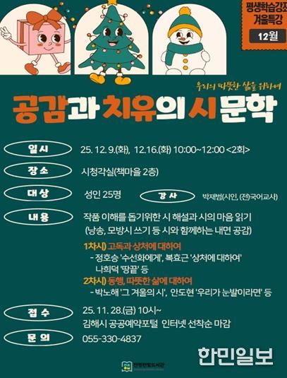 한민일보 서울포커스 김은금 기자 | 김해시 진영한빛도서관은 시민 정서 치유와 문학적 감수성 함양을 위해 오는 9일과 16일 양일간 ‘공감과 치유의 시 문학’을 운영한다고 2일 밝혔다.
