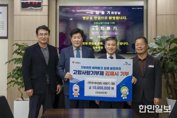 한민일보 서울포커스 박용남 기자 | 김제시는 2일 ㈜우석이엔씨 최용기 회장이 김제시 고향사랑기부제에 1,000만원을 기탁했다고 밝혔다.