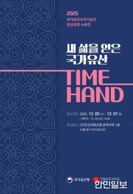 한민일보 서울포커스 박용남 기자 | 국가유산청 한국전통문화대학교 전통문화교육원은 12월 3일부터 12월 7일까지 덕수궁 선원전 영역 내 구(舊) 조선저축은행 중역사택(서울 중구)에서 ‘국가유산 수리기능인 양성과정’ 교육생들의 성과품을 모아 선보이는 '국가유산 수리기능인 양성과정 수료전, ‘새 삶을 얻은 국가유산 TIME HAND’'를 개최한다.