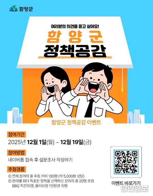 한민일보 서울포커스 김서윤 기자 | 함양군이 군정 전반에 대해 다양한 의견을 듣고, 실제로 체감한 정책을 중심으로 소통을 강화하기 위해 ‘함양군 정책공감 이벤트’를 진행한다.